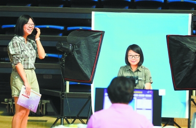 一对双胞胎姐妹一起前来报到,按顺序拍摄入学证件照。