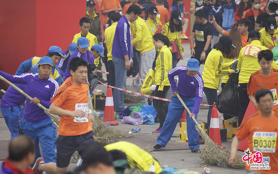 2014年10月19日,北京天安门广场,2014北京国际马拉松赛,清洁工清理广场上参赛选手的雨披等各种垃圾。据悉,组委会为比赛至少安排了200名环保志愿者在场内同垃圾回收及清理工作。中国网吴闻达 摄