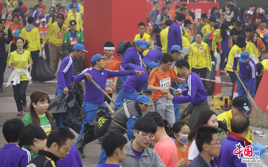 2014年10月19日,北京天安门广场,2014北京国际马拉松赛,清洁工清理广场上参赛选手的雨披等各种垃圾。据悉,组委会为比赛至少安排了200名环保志愿者在场内同垃圾回收及清理工作。中国网吴闻达 摄