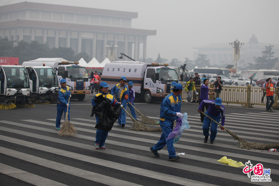 2014年10月19日,北京天安门广场,2014北京国际马拉松赛,清洁工抓紧清理广场上参赛选手的雨披等各种垃圾。记者发现,今年赛道上的垃圾比去年的赛事少很多,组委会表示,事先安排了200名环保志愿者在场内同垃圾回收及清理工作。中国网陈维松 摄