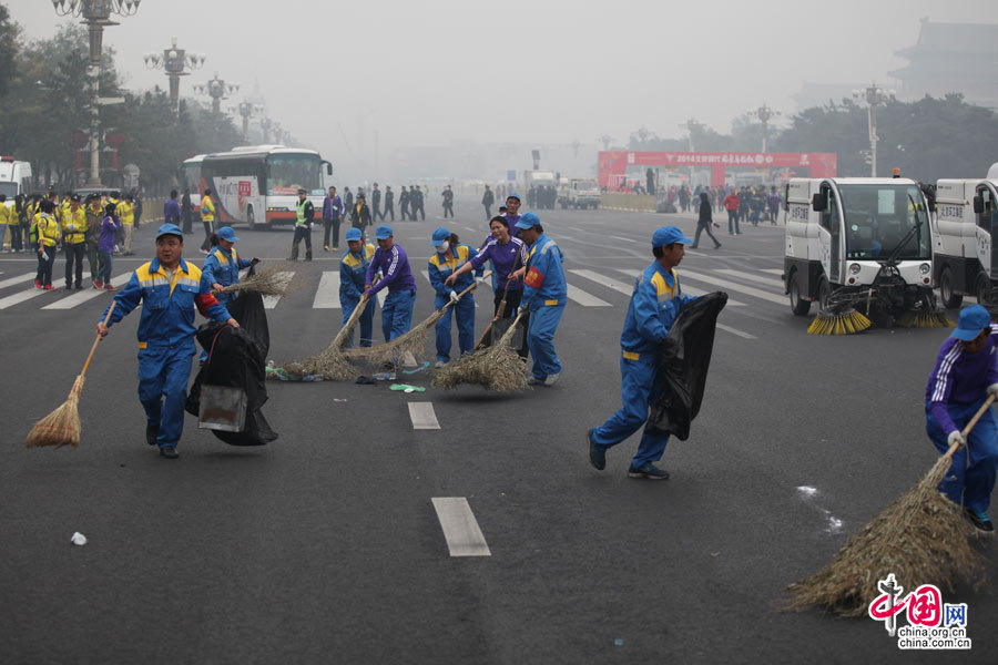 2014年10月19日,北京天安门广场,2014北京国际马拉松赛,清洁工抓紧清理广场上参赛选手的雨披等各种垃圾。记者发现,今年赛道上的垃圾比去年的赛事少很多,组委会表示,事先安排了200名环保志愿者在场内同垃圾回收及清理工作。中国网陈维松 摄