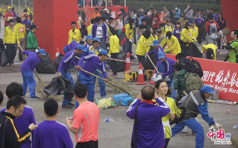 2014年10月19日,北京天安门广场,2014北京国际马拉松赛,清洁工清理广场上参赛选手的雨披等各种垃圾。据悉,组委会为比赛至少安排了200名环保志愿者在场内同垃圾回收及清理工作。中国网吴闻达 摄