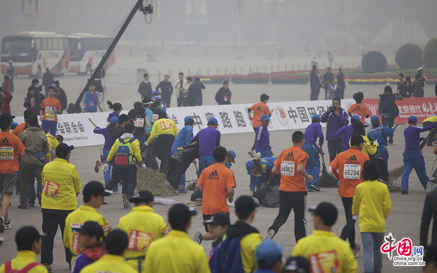 2014北京马拉松:清洁工清理广场垃圾