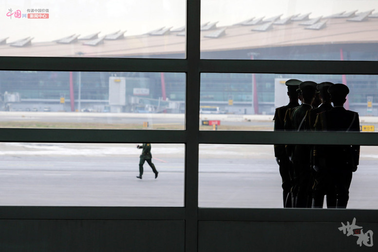 机场内执勤的武警战士。