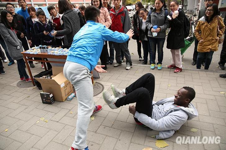 11月1日,中国武术自卫防身术教练刘若航现场演示如何摆脱异性的非礼纠缠。一位外国同学在模拟演示中被摔倒在地。千龙网王悦摄