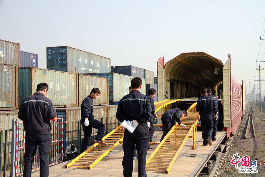 2014年11月4日 4日上午APEC会议放假期间,北京铁路局开行的六个方向自驾游汽车运输专列开始陆续装车和发车。截止11月3日报名申请参加自驾游汽车运输专列的车辆达到108辆,其中前往江南杭州地区的车辆最多达到了50辆。图为:北京客货中心经过专业培训的师傅将旅客自驾游的车辆陆续装上列车。中国网 宋一安 摄