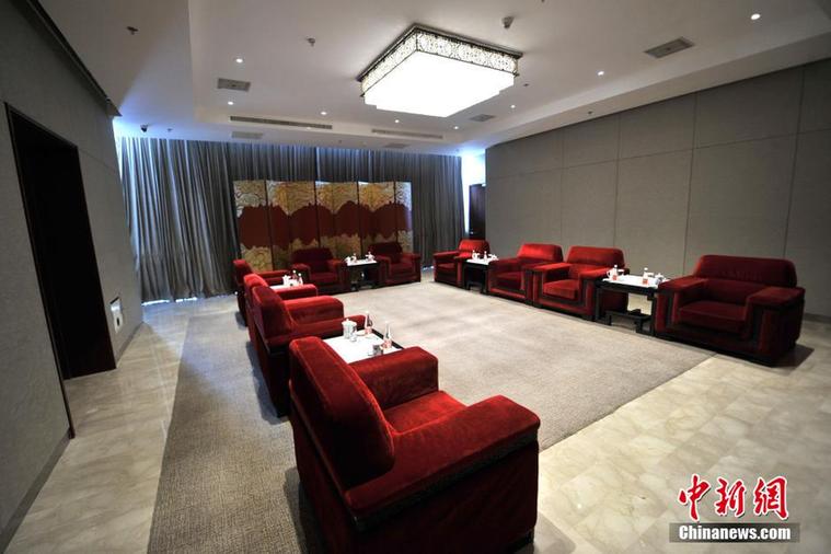 图为贵宾室中摆放的“中国红”沙发及雕刻流云图案的屏风。中新网记者金硕 摄