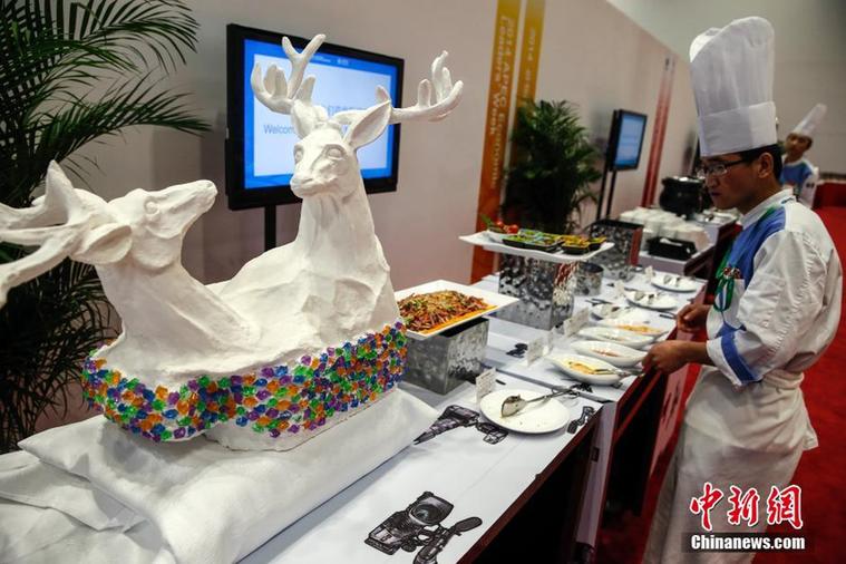 11月4日,一名2014APEC新闻中心餐饮服务人员在收拾餐具。当日,位于北京国际会议中心的APEC新闻中心正式启用。截至目前,共有4060名来自世界各地的媒体记者注册报道此次APEC会议,记者人数位居历届之首,新闻中心在媒体餐饮区为记者提供了免费午餐、晚餐以及三次茶歇。中新社发张浩 摄
