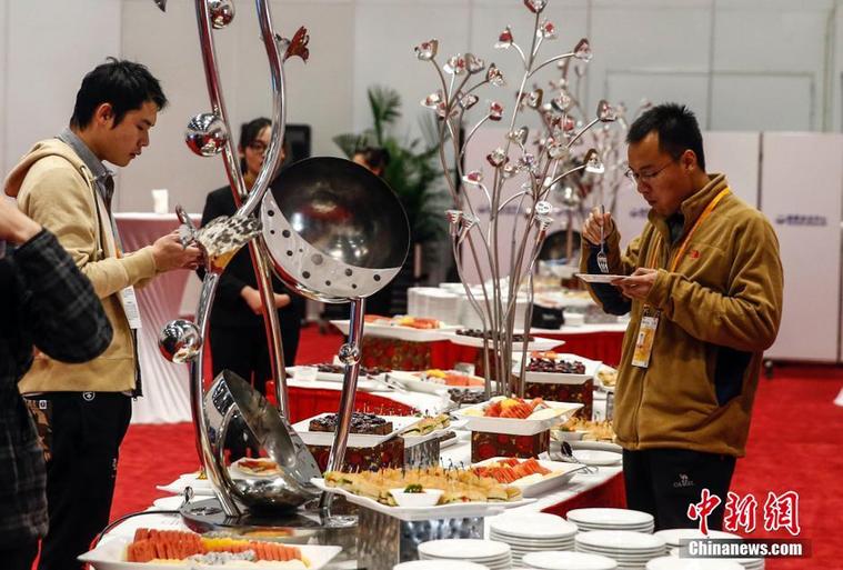 11月4日,2014APEC新闻中心内记者正在享用茶歇。当日,位于北京国际会议中心的APEC新闻中心正式启用。截至目前,共有4060名来自世界各地的媒体记者注册报道此次APEC会议,记者人数位居历届之首,新闻中心在媒体餐饮区为记者提供了免费午餐、晚餐以及三次茶歇。中新社发张浩 摄