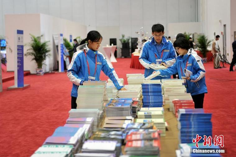 图为志愿者码放新闻中心提供的书籍。中新网记者金硕 摄