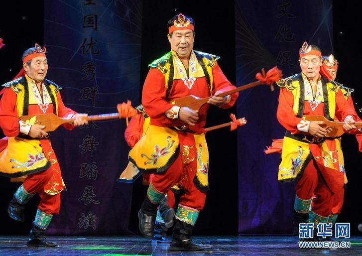 11月4日,新疆伊利爱新舍里镇老年协会表演舞蹈《吉祥的贝伦》。当日,“炫舞辉煌——2014全国优秀群众舞蹈展演”在北京民族文化宫大剧院举行。来自全国各地的17个基层演出单位,共400余名演员参加了此次活动。新华社记者唐召明摄