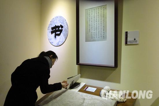 展览中有历史遗珍,更有声色俱现的艺术传人现场演示。不仅有古琴演奏、棋盘对弈,还有拓印体验区,此展区可供观众亲手体验拓片技艺,展区右手边有拓包和宣纸等工具。在拓印体验区正有位观众在小心翼翼地拓片,将一张宣纸敷在石碑上面,浸湿后轻轻敲打,墨均匀涂抹在纸上,然后一张黑地白字的拓片就复制完成了。这位观众对记者说,这是第一次接触拓印,还不太会操作,显得身手忙乱。