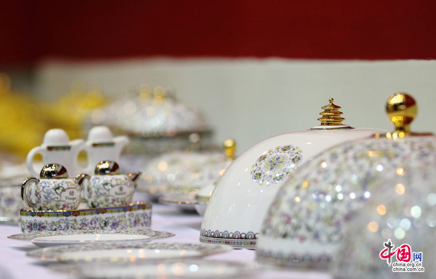 2014年12月11日,中国国际展览中心,APEC水立方国宴系列餐具。当日,持续四天的第九届中国北京国际文化创意产业博览会(简称文博会)在北京举办。中国网陈维松 摄