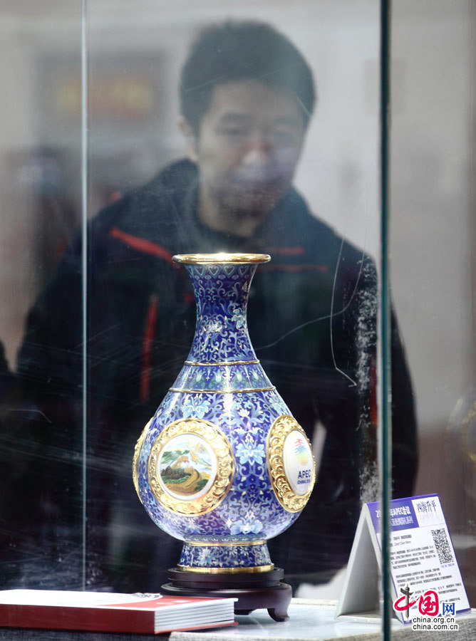 2014年12月11日,中国国际展览中心,曾在北京APEC会议上令世人关注的国礼——景泰蓝赏瓶《四海升平》。当日,持续四天的第九届中国北京国际文化创意产业博览会(简称文博会)在北京举办。中国网陈维松 摄