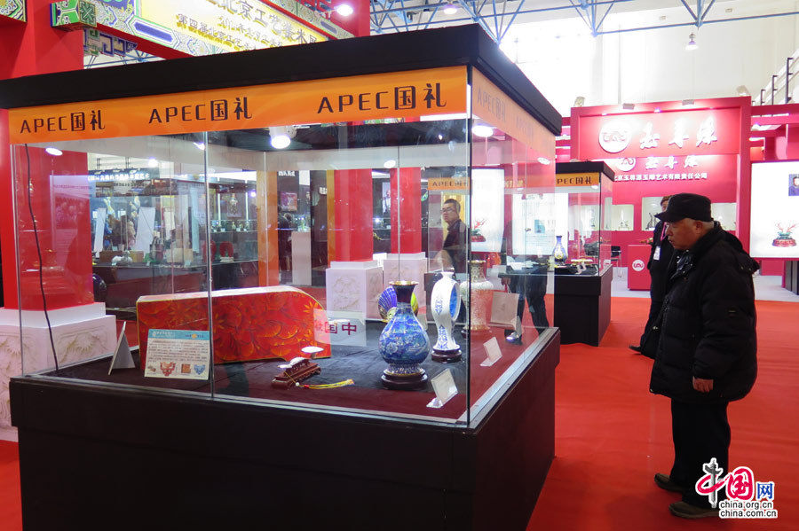 2014年12月11日,中国国际展览中心,曾在北京APEC会议上令世人关注的国礼首次公开亮相。当日,持续四天的第九届中国北京国际文化创意产业博览会(简称文博会)在北京举办。中国网陈维松 摄