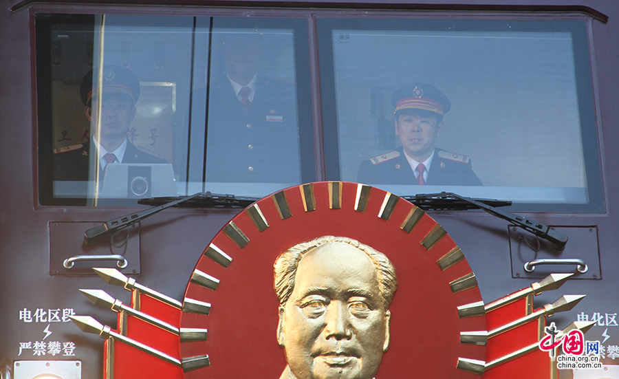 2014年12月25日,第五次换型后的“毛泽东号”机车正式投入运行,牵引T1次列车由北京站始发,将于12月26日毛泽东诞辰121周年纪念日当天早晨抵达终点站长沙站。“毛泽东号”机车诞生于1946年10月,现隶属于北京铁路局丰台机务段。68年来,从最初的蒸汽机车到内燃机车,再到此次换型后的和谐3D型大功率电力机车,“毛泽东号”见证了中国铁路的发展与进步,更创造了累计安全行驶963万公里的业绩,被誉为“火车头中的火车头”。图为“毛泽东号”第12任司机长刘钰峰带领副司机王振强、贾雪磊做发车前准备。中国网记者宋一安 摄