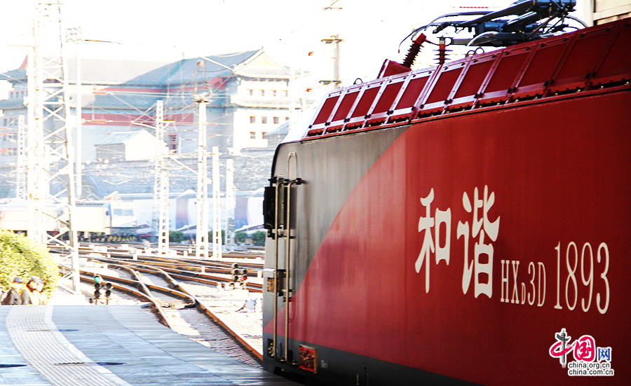 2014年12月25日,第五次换型后的“毛泽东号”机车正式投入运行,牵引T1次列车由北京站始发,将于12月26日毛泽东诞辰121周年纪念日当天早晨抵达终点站长沙站。“毛泽东号”机车诞生于1946年10月,现隶属于北京铁路局丰台机务段。68年来,从最初的蒸汽机车到内燃机车,再到此次换型后的和谐3D型大功率电力机车,“毛泽东号”见证了中国铁路的发展与进步,更创造了累计安全行驶963万公里的业绩,被誉为“火车头中的火车头”。图为换型后的“毛泽东号”机车牵引T1次列车驶离北京站。中国网记者宋一安 摄