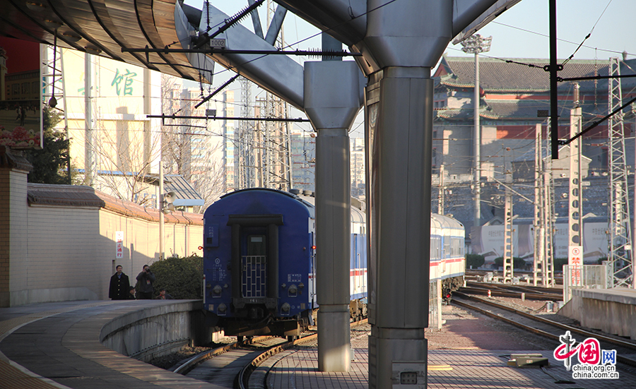 2014年12月25日,第五次换型后的“毛泽东号”机车正式投入运行,牵引T1次列车由北京站始发,将于12月26日毛泽东诞辰121周年纪念日当天早晨抵达终点站长沙站。“毛泽东号”机车诞生于1946年10月,现隶属于北京铁路局丰台机务段。68年来,从最初的蒸汽机车到内燃机车,再到此次换型后的和谐3D型大功率电力机车,“毛泽东号”见证了中国铁路的发展与进步,更创造了累计安全行驶963万公里的业绩,被誉为“火车头中的火车头”。图为换型后的“毛泽东号”机车牵引T1次列车驶离北京站。中国网记者宋一安 摄