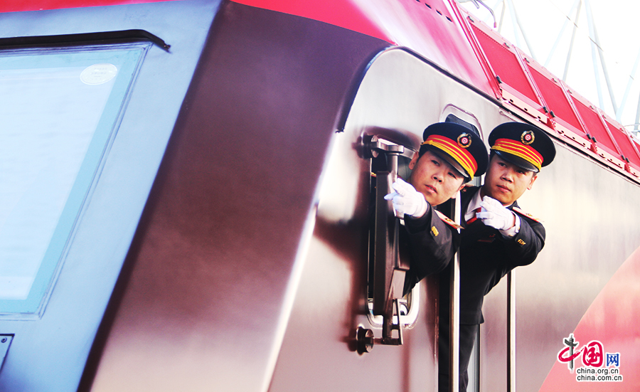 2014年12月25日,第五次换型后的“毛泽东号”机车正式投入运行,牵引T1次列车由北京站始发,将于12月26日毛泽东诞辰121周年纪念日当天早晨抵达终点站长沙站。“毛泽东号”机车诞生于1946年10月,现隶属于北京铁路局丰台机务段。68年来,从最初的蒸汽机车到内燃机车,再到此次换型后的和谐3D型大功率电力机车,“毛泽东号”见证了中国铁路的发展与进步,更创造了累计安全行驶963万公里的业绩,被誉为“火车头中的火车头”。图为“毛泽东号”第12任司机长刘钰峰与副司机王振强做发车手势。中国网记者宋一安 摄