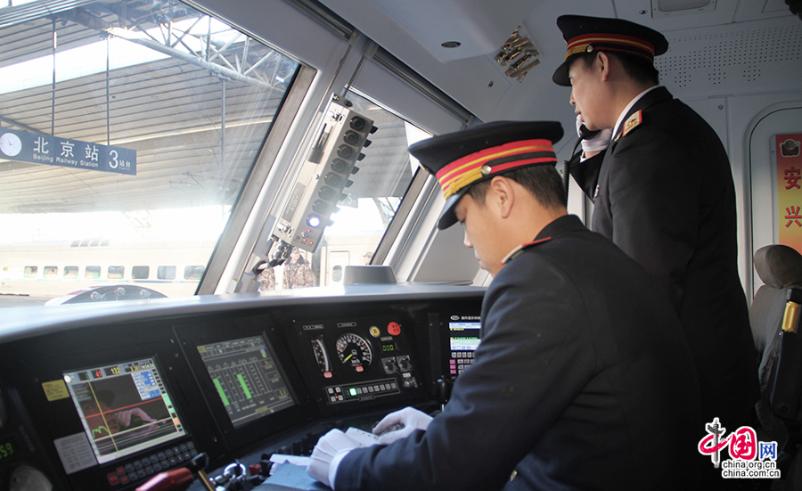 2014年12月25日,第五次换型后的“毛泽东号”机车正式投入运行,牵引T1次列车由北京站始发,将于12月26日毛泽东诞辰121周年纪念日当天早晨抵达终点站长沙站。“毛泽东号”机车诞生于1946年10月,现隶属于北京铁路局丰台机务段。68年来,从最初的蒸汽机车到内燃机车,再到此次换型后的和谐3D型大功率电力机车,“毛泽东号”见证了中国铁路的发展与进步,更创造了累计安全行驶963万公里的业绩,被誉为“火车头中的火车头”。图为“毛泽东号”副司机王振强、贾雪磊做发车前准备。中国网记者宋一安 摄