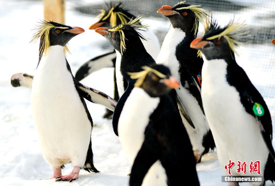 12月30日,8只“马达加斯加的企鹅”首次做客北京陶然亭公园,吸引市民围观拍照。据悉,与一般的企鹅不同的是,这些企鹅学名叫凤头黄眉企鹅,头略小,有两道后扬的黄眉毛是其鲜明特征。又因其遇到岩石双脚跳跃,所以又叫“跳岩企鹅”。陶然亭公园第五届冰雪嘉年华日前开幕,除了这8只真企鹅,陶然亭公园还在雪场中摆放了2015只仿真企鹅与市民游客一起过大年。中新社发 陆欣 摄