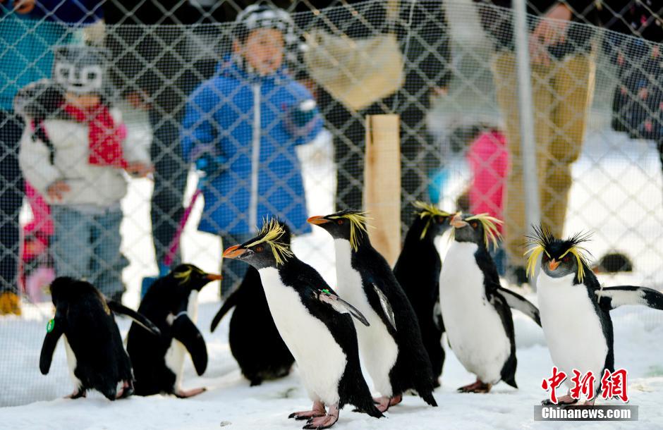 12月30日,8只“马达加斯加的企鹅”首次做客北京陶然亭公园,吸引市民围观拍照。据悉,与一般的企鹅不同的是,这些企鹅学名叫凤头黄眉企鹅,头略小,有两道后扬的黄眉毛是其鲜明特征。又因其遇到岩石双脚跳跃,所以又叫“跳岩企鹅”。陶然亭公园第五届冰雪嘉年华日前开幕,除了这8只真企鹅,陶然亭公园还在雪场中摆放了2015只仿真企鹅与市民游客一起过大年。中新社发 陆欣 摄