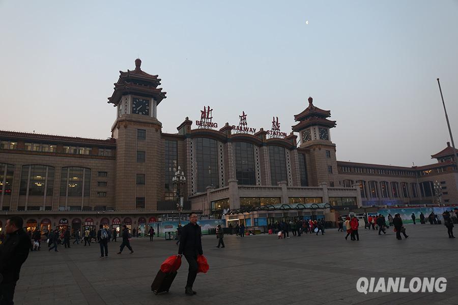 1月12日早7点35分,月亮还没有落下,乘坐第一趟D9022次列车的乘客已经到达北京。千龙网实习记者 王璟玥摄