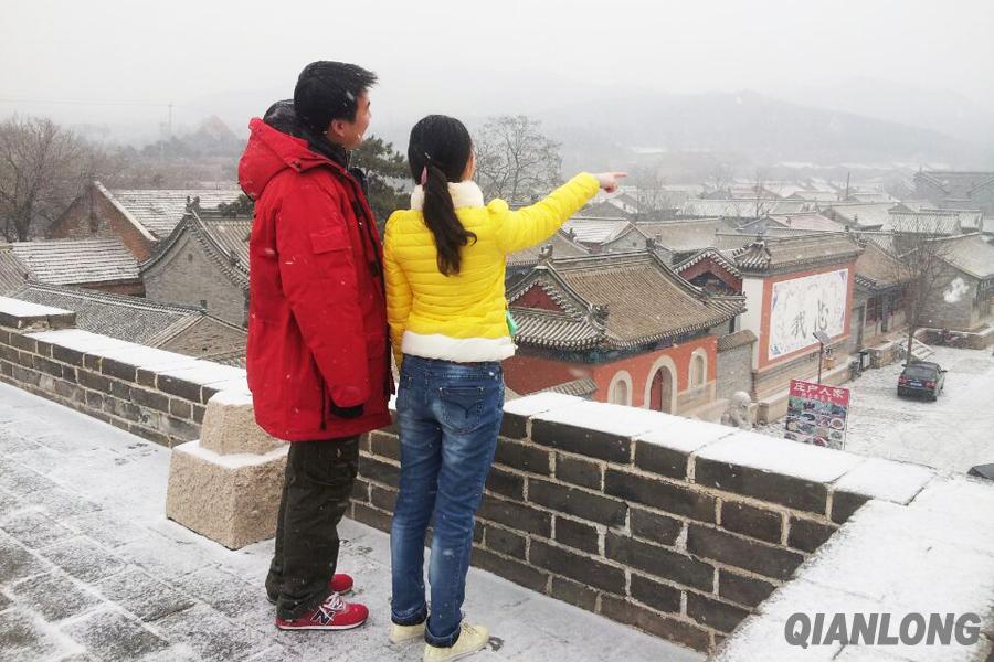 1月14日,冬雪飘落延庆八达岭镇岔道村,游人站在城墙上眺望远方的长城。 千龙网发 贾宝辉摄