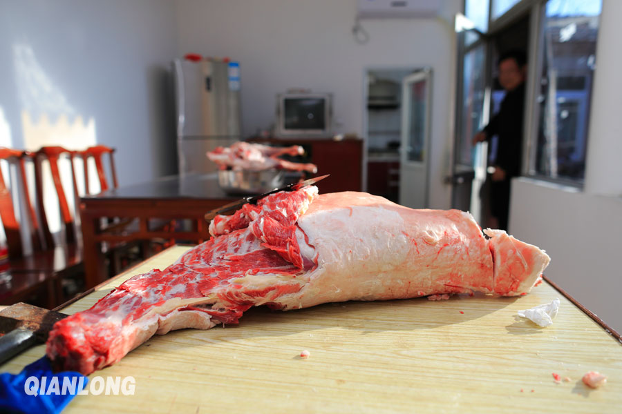 过年吃的肉已经在案上分割(2月7日摄)。千龙网记者杨理光摄