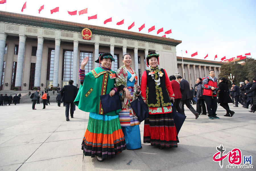 3月8日,第十二届全国人民代表大会第三次会议在人民大会堂举行第二次全体会议,图为女代表合影留念。 中国网记者 郑亮摄影