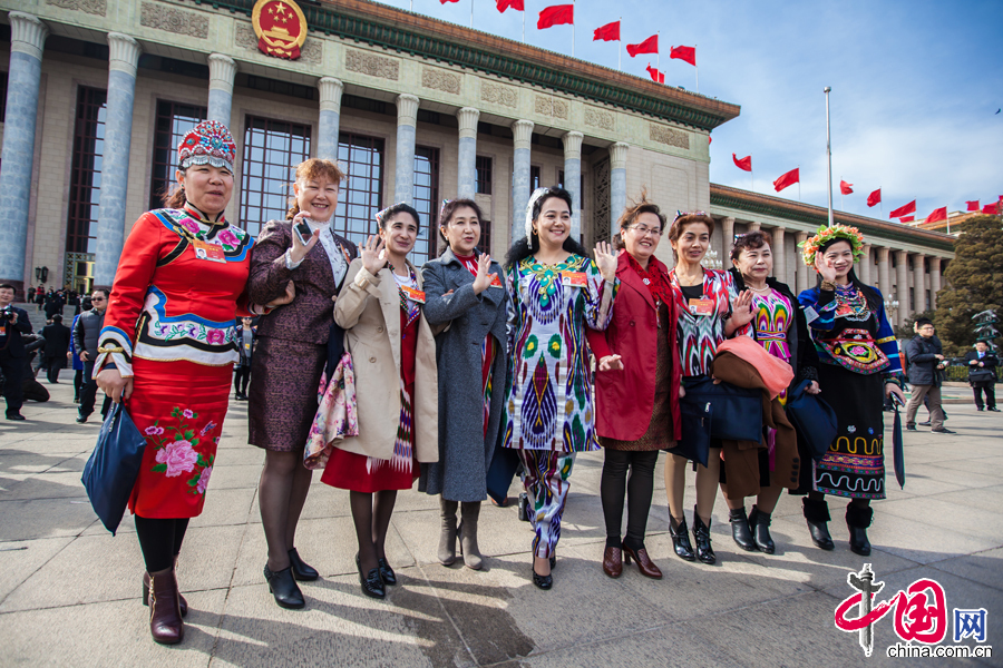 3月8日,第十二届全国人民代表大会第三次会议在人民大会堂举行第二次全体会议,图为女代表合影留念。 中国网记者 郑亮摄影