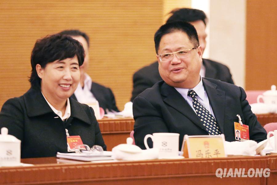 3月7日,北京代表团全体会议上,来自基层的代表朱良玉(右一)、冯乐平在会上倾听代表发言后默契交流。千龙网记者 王自彬摄