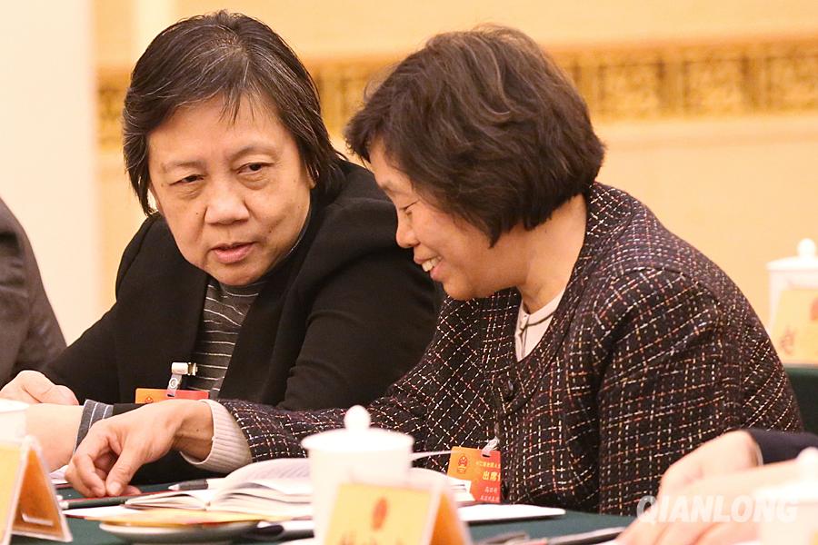 3月6日,北京代表团全体会在人民大会堂举行,高丽朴与邻座代表交流。千龙网记者 王自彬摄