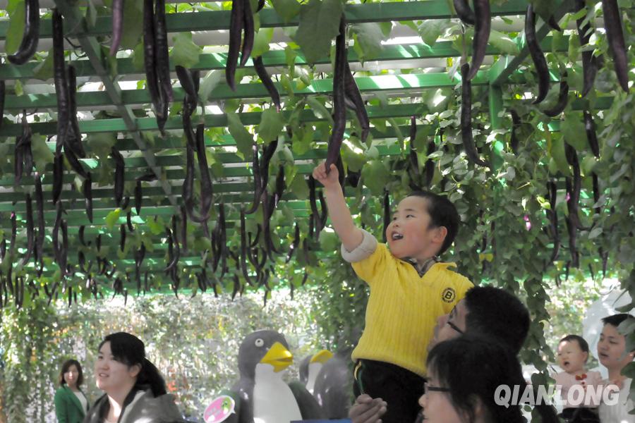 “这个茄子好长啊!”一个男孩被爸爸抱起,摸了摸紫线茄(3月21日摄)。千龙网记者 鄂晓颖摄
