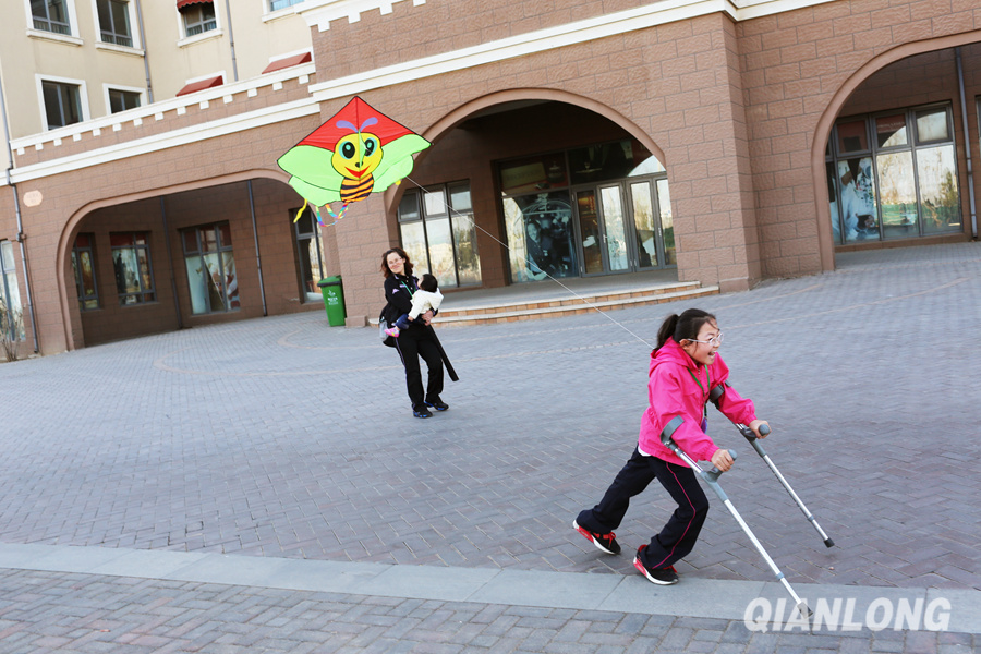 虽然部分孩子行动不太方便,但他们还是尽自己努力让风筝飞上天。这位拄着双拐的女孩正努力让自己的风筝飞起来(3月21日摄)。千龙网记者王璟玥摄