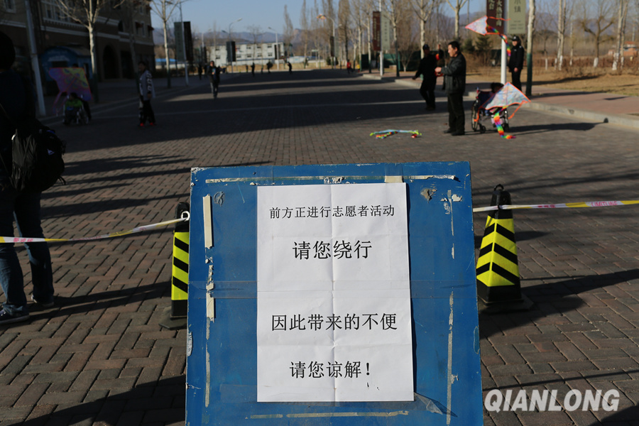 3月21日,活动地点的小区里立着这样的标志牌。是赞助方给孩子们的“特权”。千龙网记者 王璟玥摄