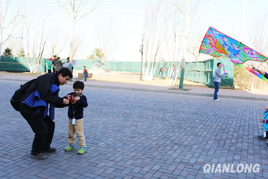 3月21日,志愿者告诉小朋友放风筝的注意事项。千龙网记者王璟玥摄