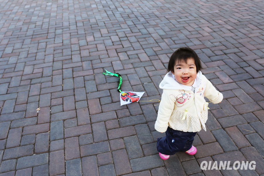 3月21日,这位小朋友发明了新玩法——遛风筝。千龙网记者王璟玥摄