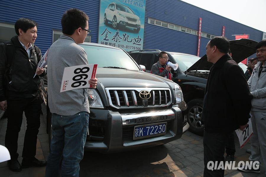 3月26日,竞拍者在北京亚运村汽车市场听工作人员介绍起拍价最高的(18万)丰田霸道。千龙网记者 李贺摄