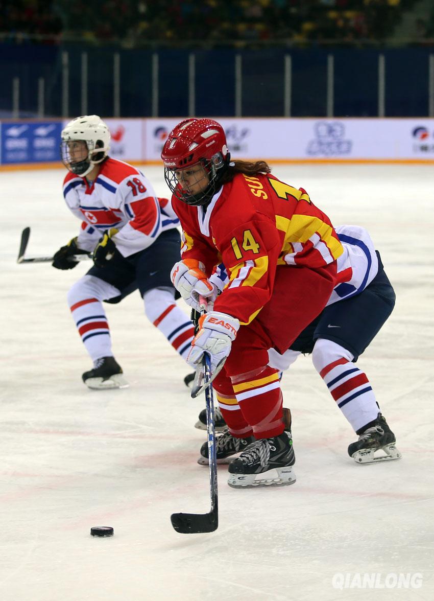 4月7日,2015年女子冰球世锦赛甲级B组比赛中国5比2朝鲜,如中国排名第一将晋级甲级A组。千龙网记者 戚连民摄
