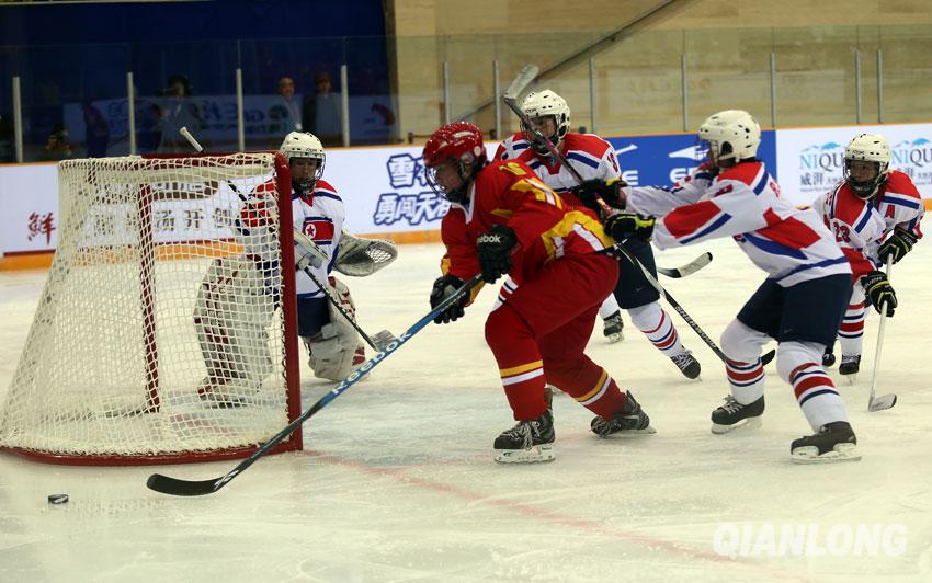 4月7日,2015年女子冰球世锦赛甲级B组比赛中国5比2朝鲜,如中国排名第一将晋级甲级A组。千龙网记者 戚连民摄