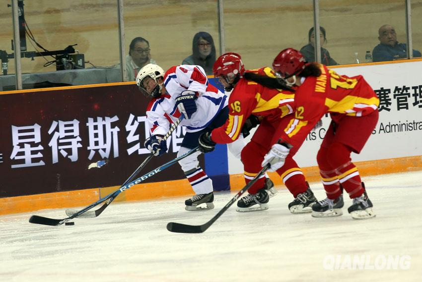4月7日,2015年女子冰球世锦赛甲级B组比赛中国5比2朝鲜,如中国排名第一将晋级甲级A组。千龙网记者 戚连民摄
