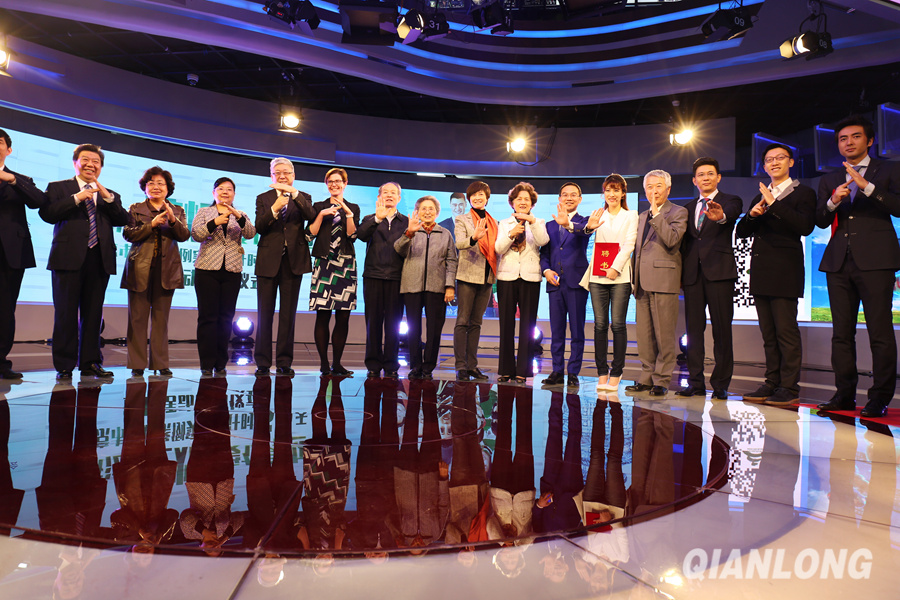 4月12日,北京市控烟条例实施倒计时50天宣传活动启动仪式上,参会嘉宾集体做出劝阻吸烟手势。千龙网记者 王璟玥摄