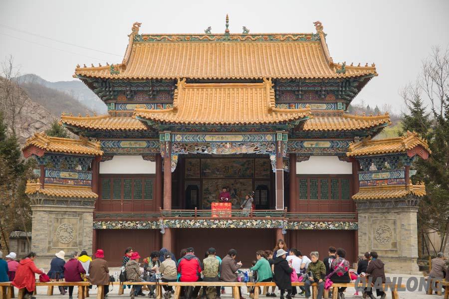 4月15日,逛完古镇的游客们坐在戏台前听评书。千龙网记者于颖摄