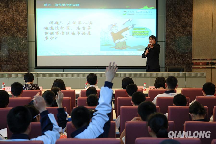 4月15日,北京市人民检察院第一分院检察官张青聚现场与学生互动。千龙网记者 王悦摄