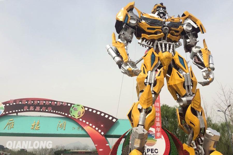 4月15日上午9时,雁栖湖景区装扮一新,等待电影嘉年华的嘉宾游客的到来。嘉年华入口的变形金刚颇为壮观。千龙网记者 王自彬摄