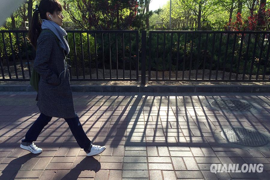 4月16日,沙尘散去,蓝天回归。北京市民在晨光中出行。千龙网记者 张启新摄