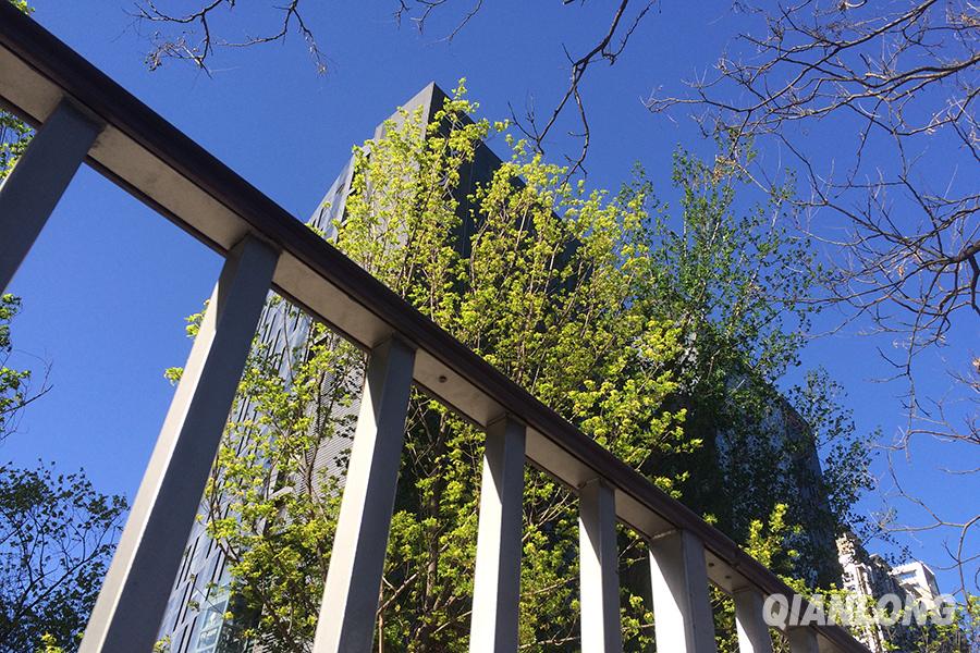 4月16日,沙尘散去,蓝天回归。刚长出嫩芽的绿树在蓝天的掩映下散发出鲜绿的光芒。千龙网记者 张启新摄