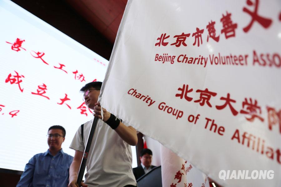 5月4日,20余所中学的学生代表接受北京市慈善义工协会授予的义工社旗帜。千龙网记者 鄂晓颖摄