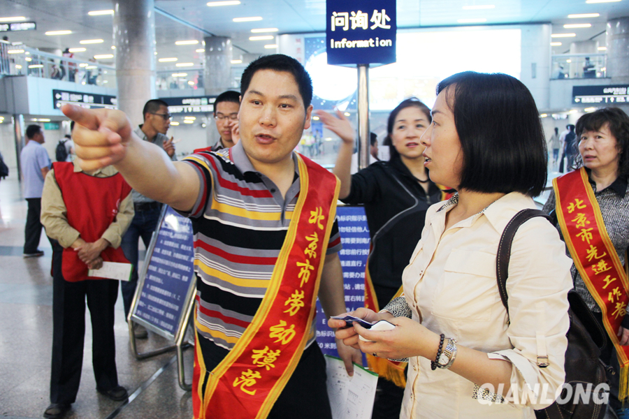 5月1日,北京市劳动模范在北京西站为旅客指路。千龙网发
